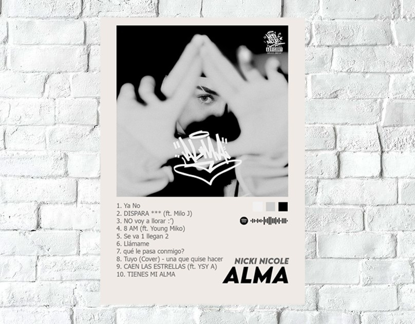 Dale estilo a tus espacios con nuestras láminas decorativas de Nicki Nicole, una de las voces más representativas del trap y la música urbana actual. Ideales para fans que quieren rendir homenaje a su música y estética con un diseño moderno y de calidad.